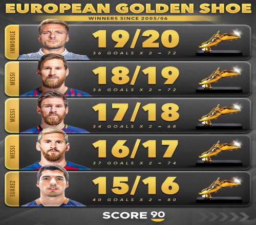 近20年欧洲金靴:梅西100分&92分C罗96分今年姆巴佩62分夺魁