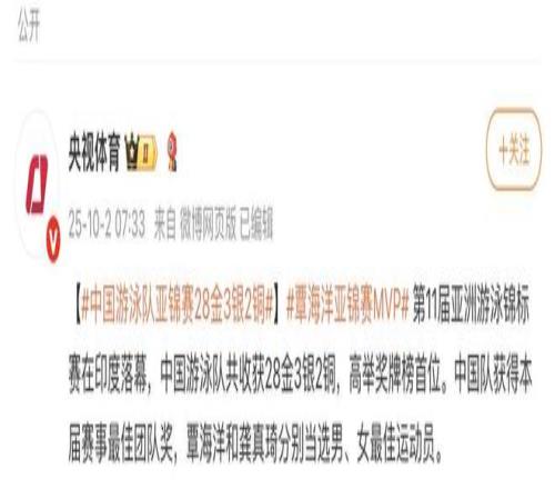 据@央视体育 消息,第11届亚洲游泳锦标赛在印度落幕,中国游泳队共收获28金3银2铜,高举奖牌榜首位。中国队获得本届赛事最佳团队奖,覃海洋和龚真琦分别当选男、女最佳运动员。 编辑 毛天宇 |