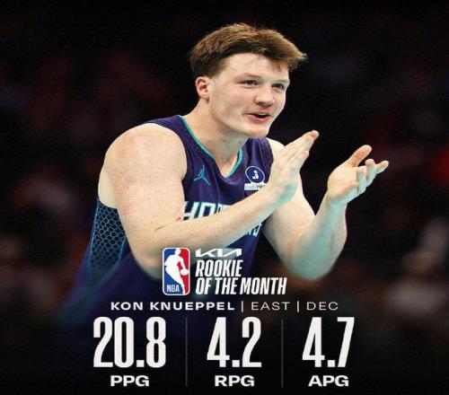在NBA官方公布的最新一期MVP榜中,丹佛掘金的尼古拉-约基奇继续雄踞榜首,俄克拉荷马雷霆的谢伊-吉尔杰斯-亚历山大稳居次席,洛杉矶湖人的卢卡-东契奇也位列三甲,圣安东尼奥马刺中锋文班亚马杀进前五之列。 12月最佳新秀:西部弗拉格 东部克努佩尔 NBA官方还公布了2025-26赛季12月的月最佳新秀,达拉斯独行侠的库珀-弗拉格与夏洛特黄蜂的康-克努佩尔分别当选。