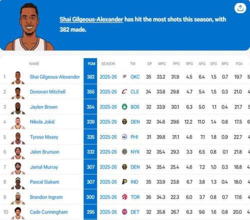 比赛期间,转播方晒出了一组数据,在本赛季的运动战投篮命中数方面,雷霆队当家球星亚历山大高居榜首。