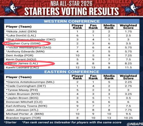可是问题出现在了球员和球迷的投票,库里虽然说总分平均下来是排在了西部的第4,可是库里的球员投票是整个西部的第2,球迷投票是西区第3,甚至比排名在他前面的东契奇、亚历山大都高。也就是说球员投票当中,除了约基奇,他们都觉得库里是配得上第2个入选的。 而在球迷方面,美国球迷觉得除了东契奇和约基奇,第3个该入选的就是库里,他比总决赛FMVP亚历山大的排名也高。球员投票和球迷投票一个第2一个第3,库里直接起飞了,而反观另外一边的詹姆斯呢?球员投票是第8,球迷投票也是第8,这是他和库里拉开最大差距的一个关键的原因。