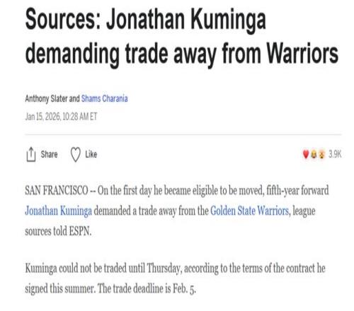 大鱼二:库明加 库明加与勇士队的闹剧一直从休赛季延续至今,哪怕完成续约也没有解决问题,科尔与库明加本赛季再度闹翻。 名记Shams在库明加获得交易资格第一天就曝出其团队已经向勇士提出交易申请,勇士也一直积极为其寻找下家。