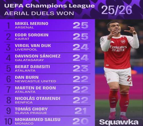 Squawka统计,本赛季欧冠至今为止争顶成功次数最多(并列)的球员是梅里诺:25次。 梅里诺确实对抗非常好,而且擅长头球。争顶成功率不是光看身高、弹跳、力量,预判和卡位也非常重要,梅里诺看起来粗枝大叶,但其实他球商不低,他的技术不是单纯体现在脚下,而是在观察和判断上,很多人低估了这点。 当然梅里诺优缺点很明显,我还是认为他踢中场倒是不如踢中锋或者二前锋有威胁……