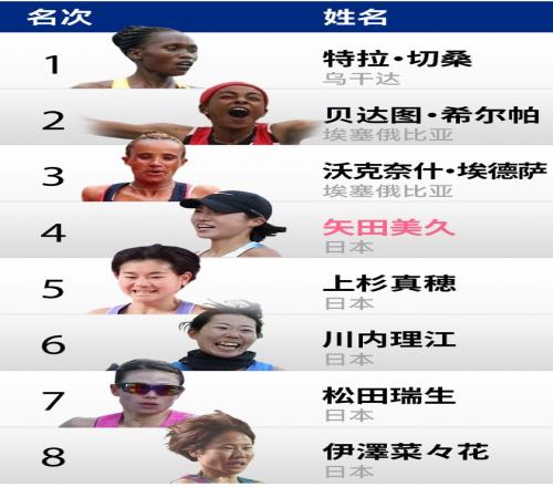1月25日进行的大阪国际女子马拉松,诞生了亚洲女子马拉松的又一位新星。效力于日本实业团队Edion的矢田美久在自己的首马尝试中,跑出了2:19:57的成绩。这个成绩打破了安藤友香保持的2:21:36的日本女子首马纪录,也让矢田美久成为第六位突破220大关的日本女选手。