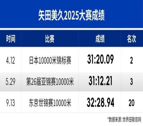 去年东京,矢田美久代表日本,获得了参加世锦赛万米比赛的一席之位。不过,在高温中跑出32:28.94的她仅仅获得赛事第20名。这个成绩距离她的万米PB有1分多的差距。