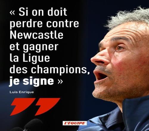 到了对阵纽卡的比赛之前,有记者问起之前巴黎对赛纽卡的疲软(2023年10月小组赛曾被纽卡1比4暴揍),恩里克又一次发出怪论:如果输给纽卡斯尔,之后我们可以拿到欧冠,我宁愿输给纽卡斯尔。